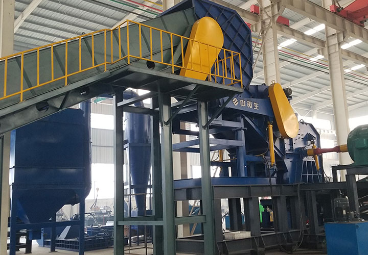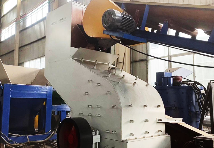 破碎線主機殼體采用特厚鋼板制造,內(nèi)襯為高錳鑄鋼件,可更換;主機轉(zhuǎn)子盤安裝于水平軸上,轉(zhuǎn)子盤圓周分布有銷軸,軸向懸有錘頭;主軸用滾珠軸承支撐,循環(huán)油強制潤滑冷卻,并裝有溫度傳感器;進料口裝有液壓輥筒喂料裝置,位置一高一低,同向旋轉(zhuǎn),能將大件松散物料壓扁,送入破碎腔內(nèi)。