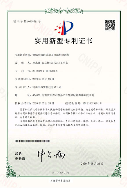 • ZL2019216195332銅鋁水箱破碎加工用出鐵輸送裝置