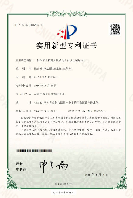 • ZL2019216457104.一種銅鋁水箱破碎用振動(dòng)篩分裝置